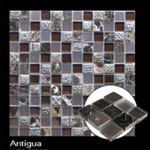 # Sheet backing: Mesh# Sheet size: 11 3/4" x 11 3/4"# Tile size: 7/8" x 7/8"# Thickness: 5/16" (8mm)# Grout joint: 1/8"# Finish shown: Tuvalu.../ Renaissance Glass Tile - Monarchy Blends 7/8" x 7/8" Mesh Mounted Mosaic in Antiguad Mosaic in Tuvalu / Wall Tile Glass